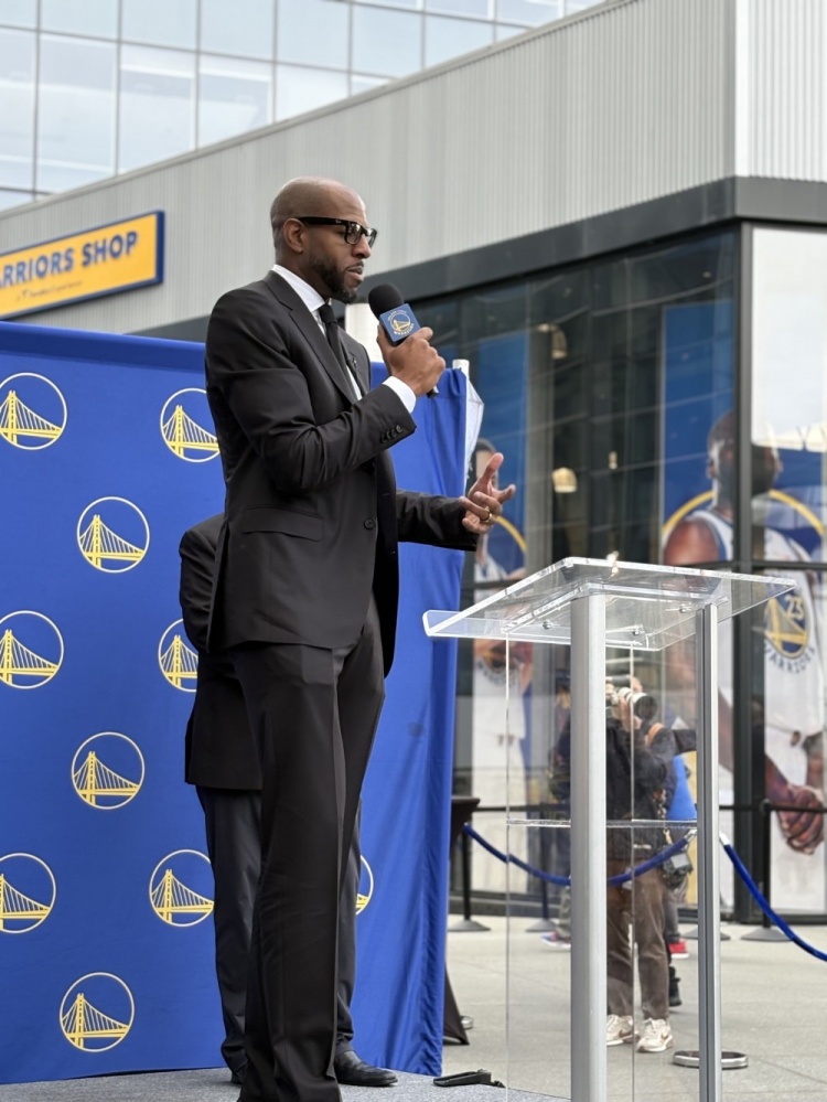 而我們現在所在的地方,就是一個(gè)成功運營(yíng)的典范。當他們買(mǎi)下球隊時(shí),他們告訴我們,他們會(huì )掛上冠軍旗幟,而他們確實(shí)做到了。所以讓我們來(lái)聽(tīng)聽(tīng)這兩位——讓勇士成為全球知名品牌的兩位人士的發(fā)言。
