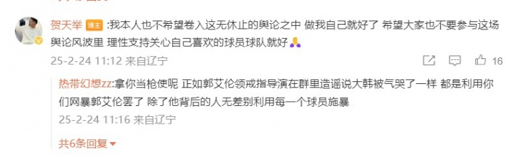 之后,賀天舉還在這條動(dòng)態(tài)的評論區寫(xiě)道:“我本人也不希望卷入這無(wú)休止的輿論之中 做我自己就好了 希望大家也不要參與這場(chǎng)輿論風(fēng)波里 理性支持關(guān)心自己喜歡的球員球隊就好????”