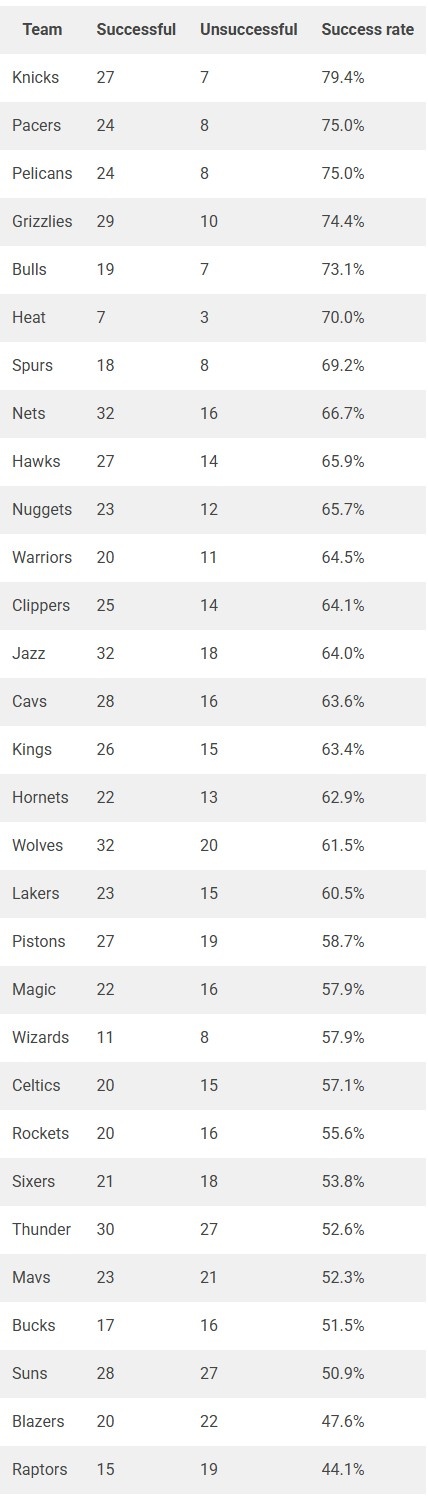 自2019年NBA引入挑戰規則以來(lái),教練們在如何有效使用挑戰方面經(jīng)歷了一段摸索期。在規則實(shí)施的第一年,教練挑戰的整體成功率僅為44%。如今成功率已經(jīng)顯著(zhù)上升,截至2月23日,NBA教練挑戰的成功率已達到61%。教練們在如何使用挑戰方面變得更加聰明,無(wú)論是在選擇挑戰的回合類(lèi)型上,還是在快速查看回放以做出更好決策方面。盡管如此,聯(lián)盟中各位教練的挑戰成功率和使用頻率仍存在較大差異。不過(guò),挑戰的決定遠比球迷在電視機前看到的要復雜得多。