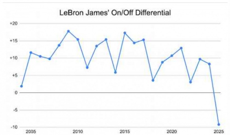 但詹姆斯尚未顯示出任何明顯的下滑跡象。即使是職業(yè)生涯首次出現負的場(chǎng)上場(chǎng)下球隊凈效率差值,實(shí)際上也是歷史級別糟糕運氣的體現,而不是詹姆斯自身的問(wèn)題。