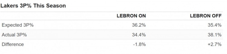 (圖為詹姆斯在場(chǎng)和不在場(chǎng)時(shí),湖人其他隊友的三分命中率)