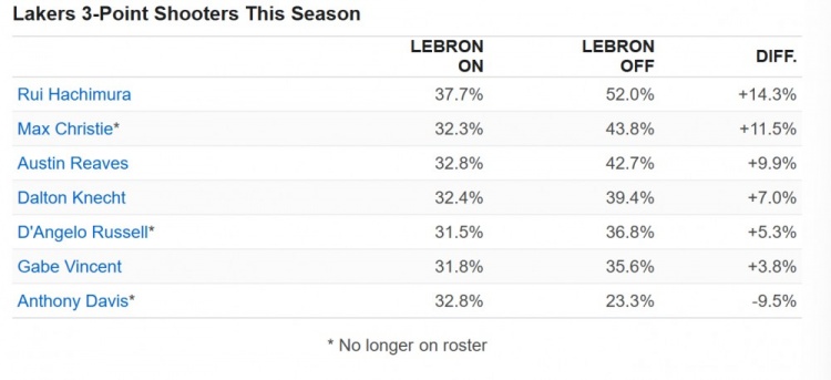 問(wèn)題在于,詹姆斯的隊友和他一同在場(chǎng)時(shí)莫名其妙地在外線(xiàn)投射掙扎,而在他休息時(shí)卻手感火熱。除了已經(jīng)離隊的安東尼-戴維斯,每位與詹姆斯共同出場(chǎng)至少400分鐘的隊友在詹姆斯下場(chǎng)時(shí)的三分命中率都顯著(zhù)提高。