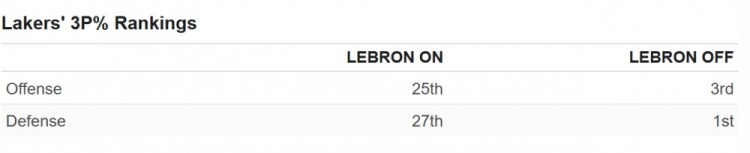 總體而言,這是詹姆斯職業(yè)生涯中首次在進(jìn)攻端出現負的場(chǎng)上場(chǎng)下球隊效率差值,這意味著(zhù)當他在場(chǎng)時(shí),球隊的進(jìn)攻效率更低。然而,這一前所未有的現象是由于詭異的三分霉運,而不是因為湖人在沒(méi)有他時(shí)擁有更好的進(jìn)攻體系。