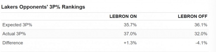 此外,當詹姆斯在場(chǎng)時(shí),湖人對手的預期三分命中率更低。