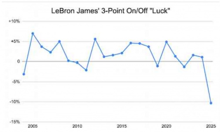 -10.3%的三分“運氣值”不僅對詹姆斯來(lái)說(shuō)是一個(gè)異常值,對所有NBA球員來(lái)說(shuō)也是如此。上一次有球員在至少1500分鐘的出場(chǎng)時(shí)間內擁有更差的三分運氣值還要追溯到2010年,當時(shí)三分球的普及程度遠不如現在。換句話(huà)說(shuō),詹姆斯目前正在經(jīng)歷現代快節奏和空間化比賽中所有球員里最糟糕的三分運氣值。