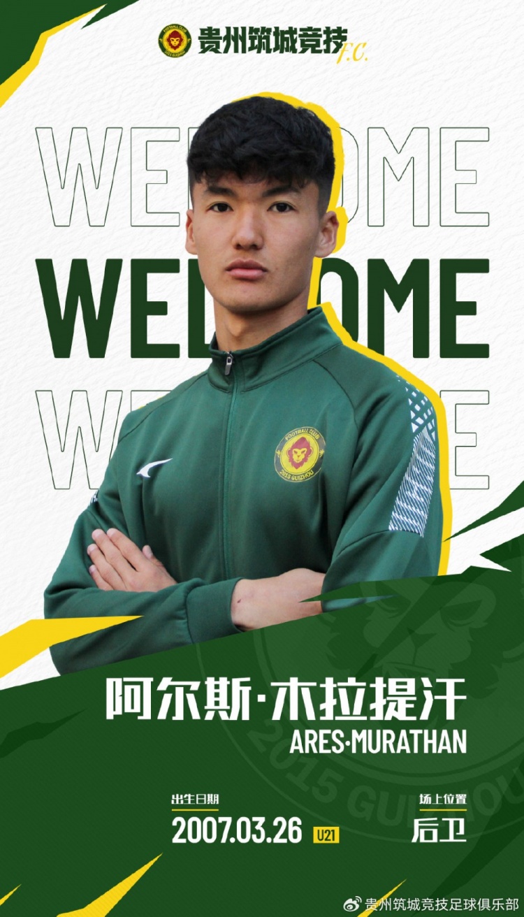 ??經(jīng)與球員協(xié)商一致,阿爾斯-木拉提汗正式加盟貴州筑城競技足球俱樂(lè )部。阿爾斯-木拉提汗2007年3月26日出生于新疆烏魯木齊,身高192cm,體重80kg,司職中后衛。