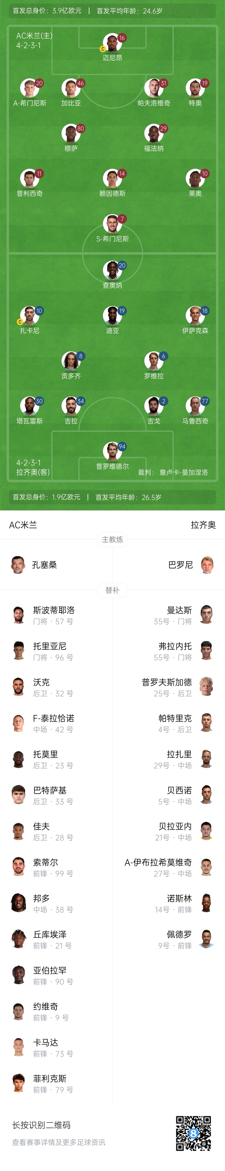 3月3日訊 意甲第27輪,AC米蘭主場(chǎng)迎戰拉齊奧比賽即將打響。賽前首發(fā)出爐。