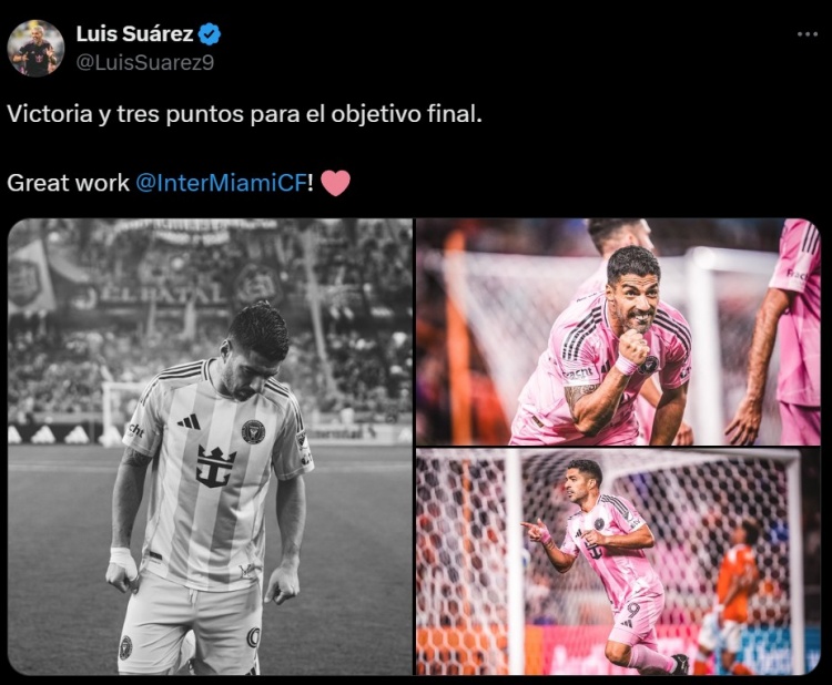 蘇亞雷斯也在賽后通過(guò)社媒曬出自己的慶祝照,并配文:“勝利與通向最終目標的關(guān)鍵3分。全隊的表現很棒@邁阿密?chē)H俱樂(lè )部?!?/p>