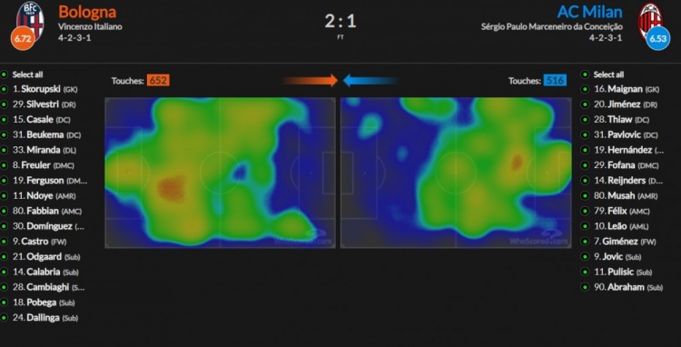 輸給博洛尼亞,米蘭的熱區表現:中場(chǎng)根本沒(méi)有任何的控制力