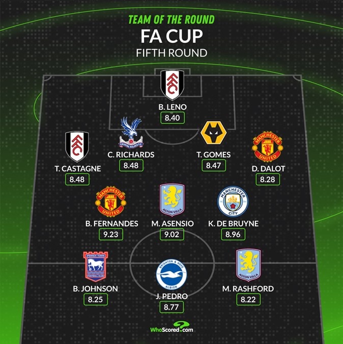 3月4日訊 足總杯十六強戰已經(jīng)完賽,whoscored也統計了本輪足總杯評分最佳陣容,富勒姆、維拉和曼聯(lián)各2人入圍。