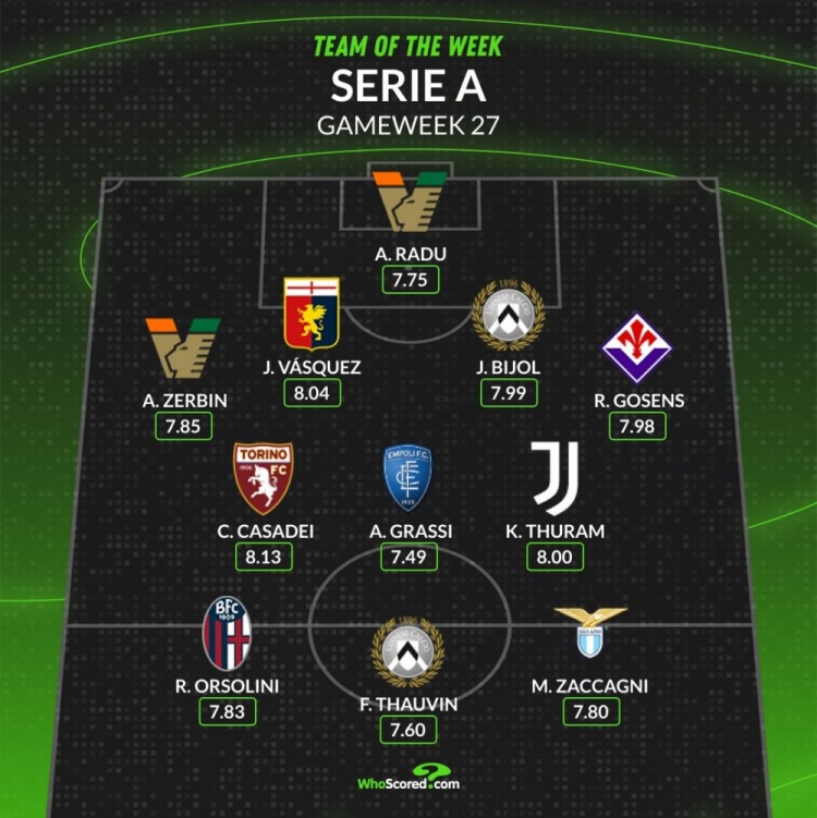 后衛:澤爾賓(威尼斯,7.85分)、約翰-巴斯克斯(熱那亞,8.04分)、比約爾(烏迪內斯,7.99分)、戈森斯(佛羅倫薩,7.98分)