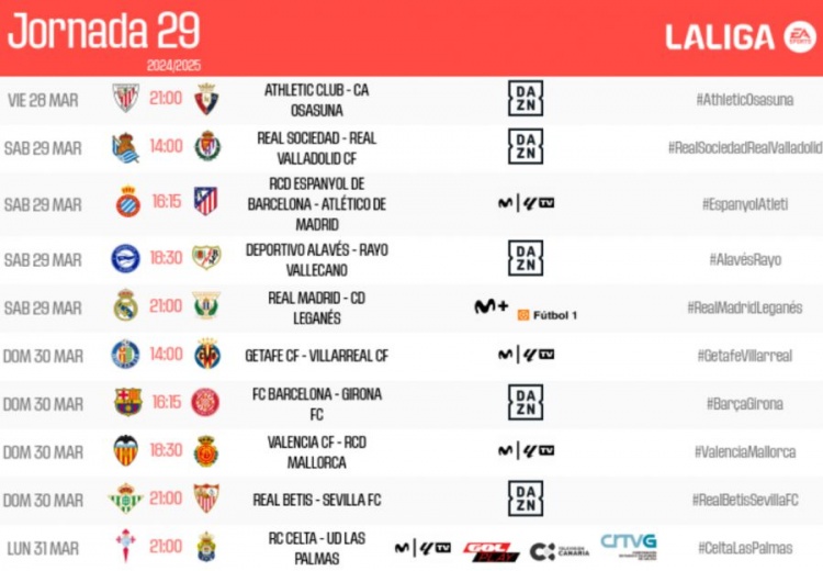 3月4日訊 西甲官網(wǎng)剛剛公布了第29輪開(kāi)球時(shí)間,其中皇馬主場(chǎng)迎戰萊加內斯的比賽將于北京時(shí)間3月30日凌晨4點(diǎn)進(jìn)行,馬競對陣西班牙人、巴薩對陣赫羅納的比賽則分別將于3月29日、30日晚上舉行。