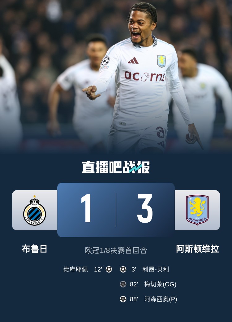 歐冠1/8決賽首回合,維拉3-1布魯日占先機。上半場(chǎng),明斯助攻貝利閃擊得手,德克伊珀推射扳平;下半場(chǎng),阿森西奧替補造險,措利斯失單刀,羅杰斯造梅切勒烏龍,卡什造點(diǎn)阿森西奧點(diǎn)射擴大比分。