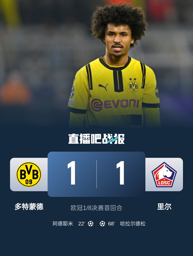 歐冠1/8決賽首回合,多特1-1里爾。上半場(chǎng),阿德耶米造險+貼地斬破門(mén),格羅斯進(jìn)球被吹;下半場(chǎng),哈拉爾德松扳平比分。