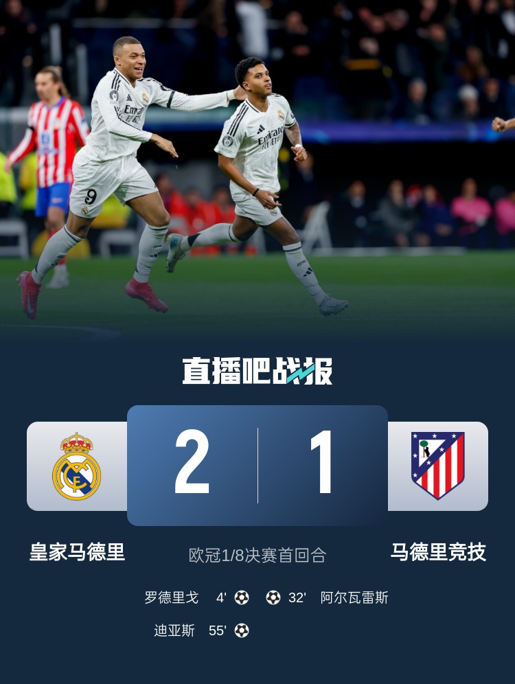 歐冠1/8決賽首回合,皇馬2-1馬競,占據晉級先機。上半場(chǎng),巴爾韋德助攻羅德里戈內切擺脫防守破門(mén),阿爾瓦雷斯過(guò)掉卡馬文加后世界波扳平;下半場(chǎng),卜拉欣-迪亞斯禁區內蝴蝶穿花步過(guò)人后建功。