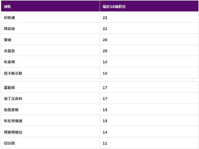前12名球隊最近10場(chǎng)聯(lián)賽戰績(jì)
