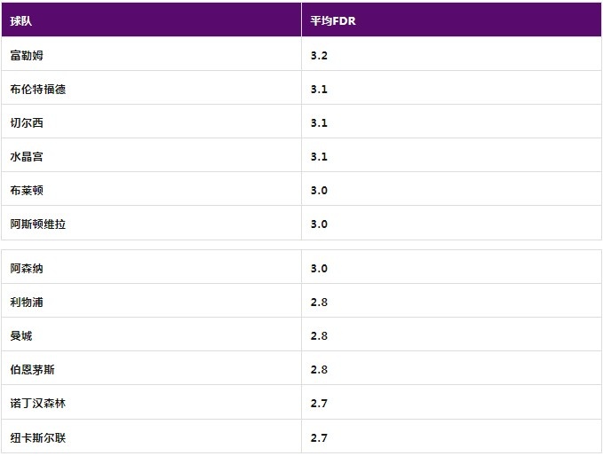 前12名球隊剩余聯(lián)賽賽程平均FDR