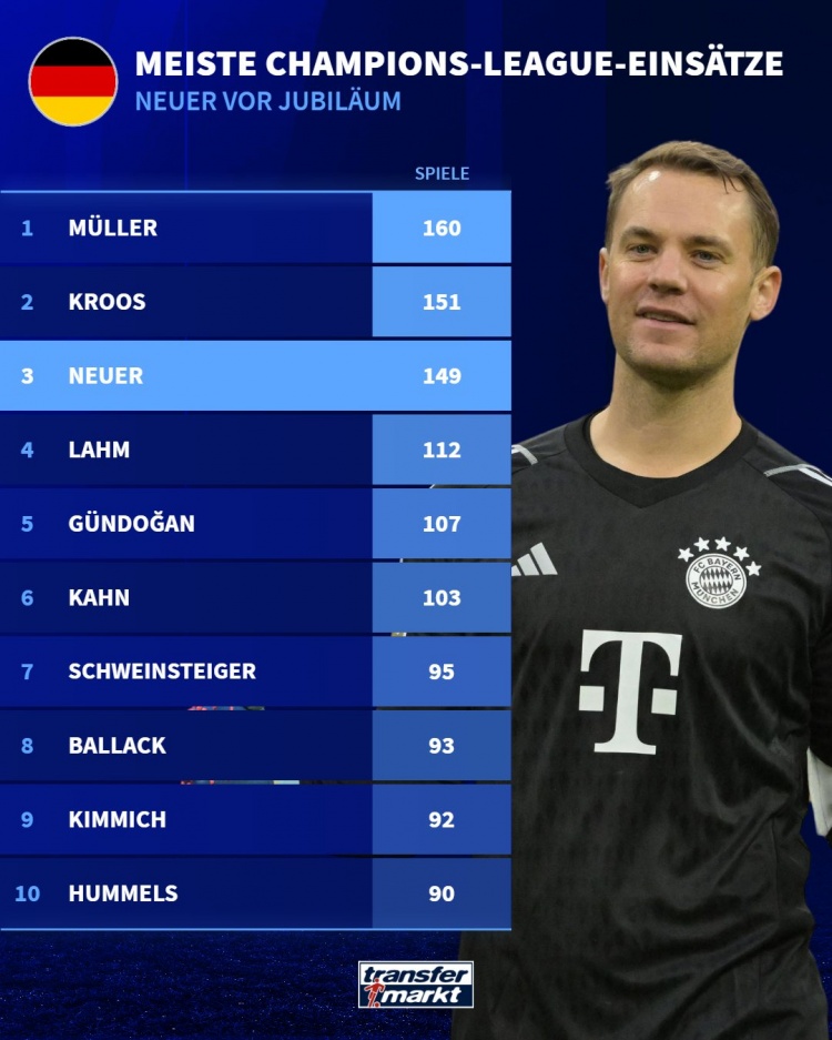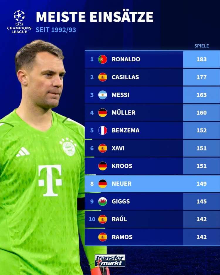 目前,諾伊爾是歐冠出場(chǎng)第三多的德國球員,也在歐冠歷史出場(chǎng)次數榜中排名第8。