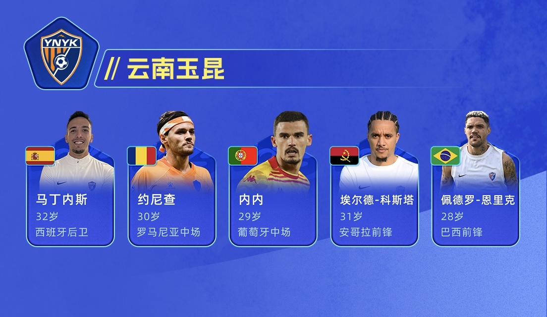 目前云南玉昆的外援有馬丁內斯、約尼查、內內、佩德羅-恩里克以及埃爾德-科斯塔,其中馬丁內斯、約尼查、內內、佩德羅-恩里克,四人都代表云南玉昆參加了前兩輪中超比賽,只有埃爾德-科斯塔還未出場(chǎng)。