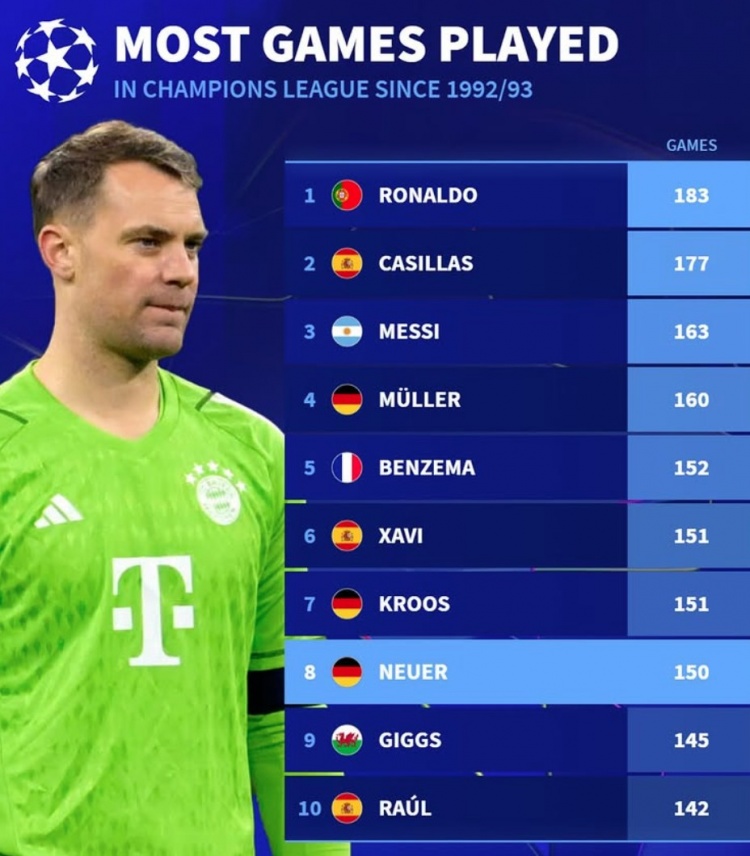 3月6日訊 拜仁在昨晚歐冠焦點(diǎn)戰3-0完勝勒沃庫森,諾伊爾首發(fā)解鎖個(gè)人150場(chǎng)里程碑?!掇D會(huì )市場(chǎng)》統計顯示他也是歐冠改制后出場(chǎng)榜第8位。