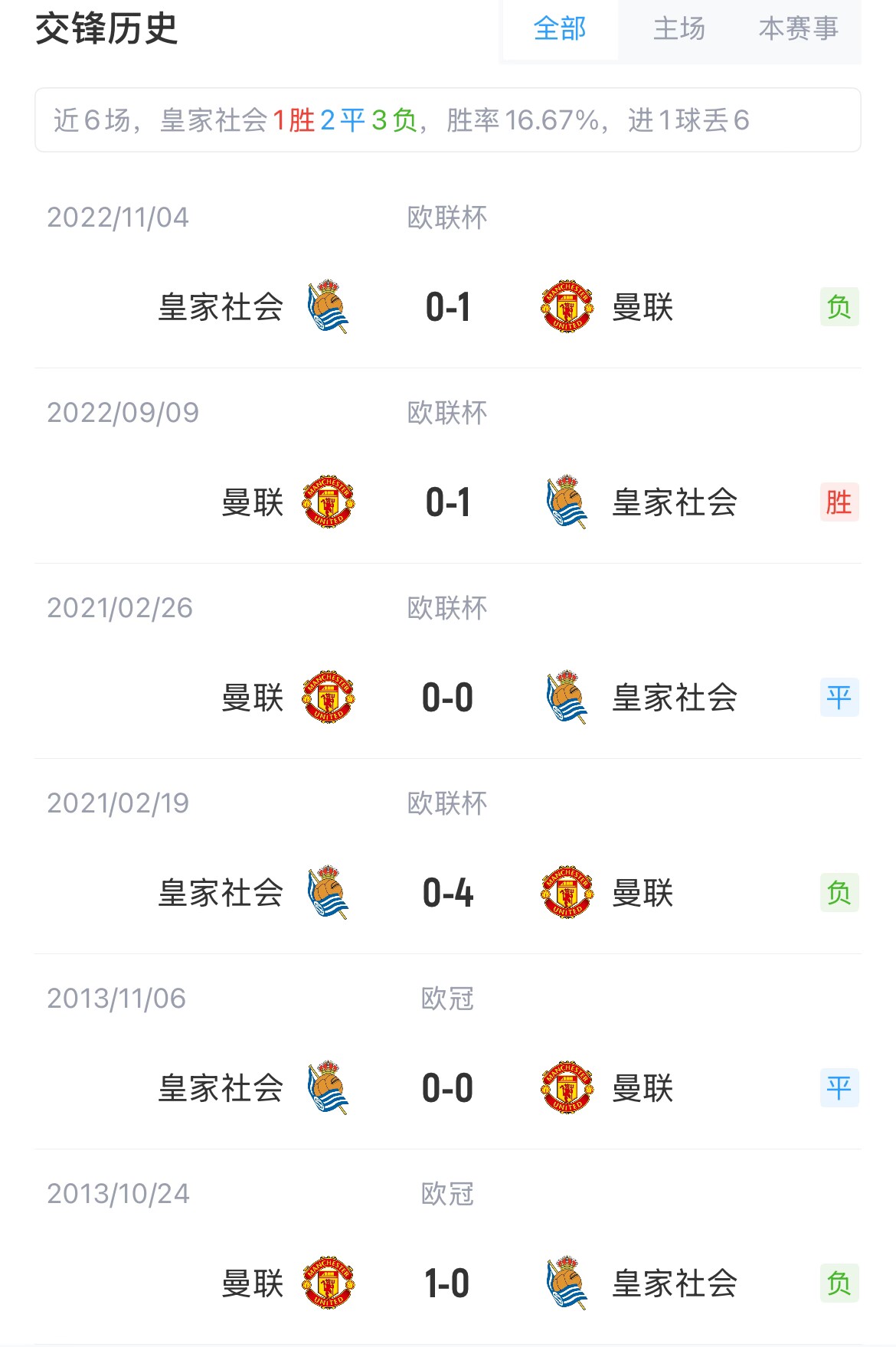 曼聯(lián)與皇家社會(huì )共交手過(guò)6次,曼聯(lián)3勝2平1負。此外,本賽季歐聯(lián)杯,曼聯(lián)目前是唯一一支不敗球隊,他們聯(lián)賽階段5勝3平。