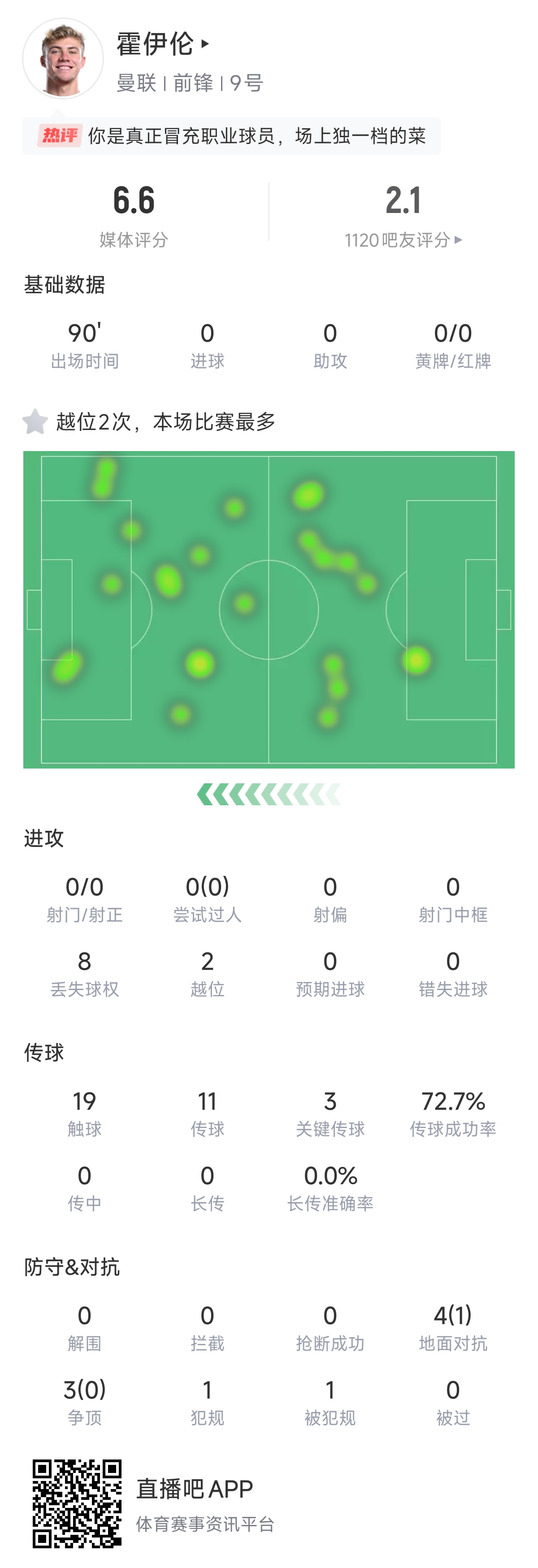 22歲的霍伊倫本賽季在歐聯(lián)杯有5球入賬,數據還算不錯。但是賽季總數據36場(chǎng)7球1助實(shí)在對不起他6000萬(wàn)歐的身價(jià)。本場(chǎng)比賽霍伊倫打滿(mǎn)全場(chǎng),熱點(diǎn)圖也遍布全場(chǎng),有3次關(guān)鍵傳球,可惜沒(méi)有射門(mén),也沒(méi)有過(guò)人。此外,2次越位和7次對抗1成功的數據也略顯尷尬。