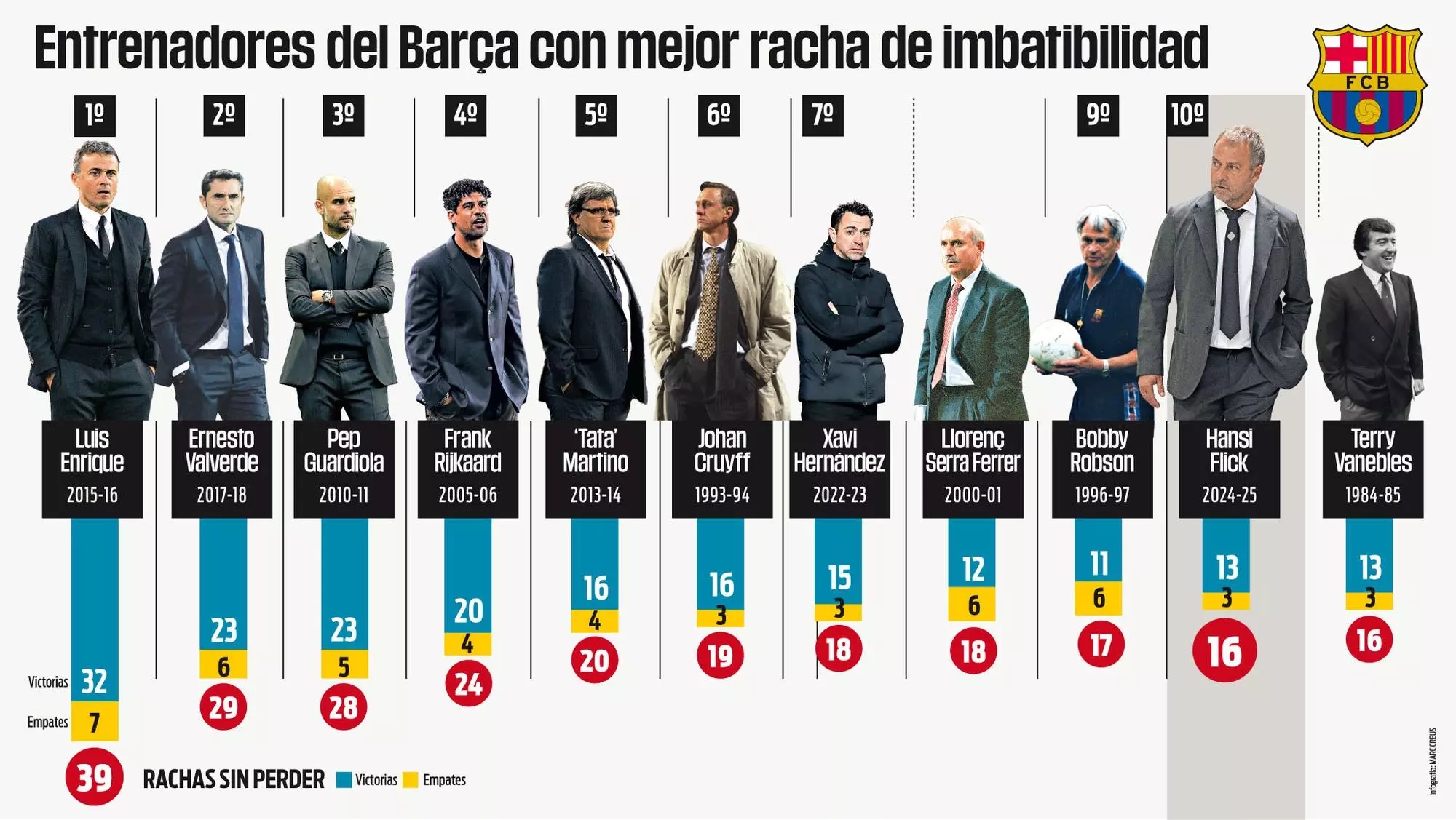 3月7日訊 根據《每日體育報》的報道,弗里克目前執教巴薩16場(chǎng)取得13勝3平的不敗戰績(jì),排名隊史第10位。
