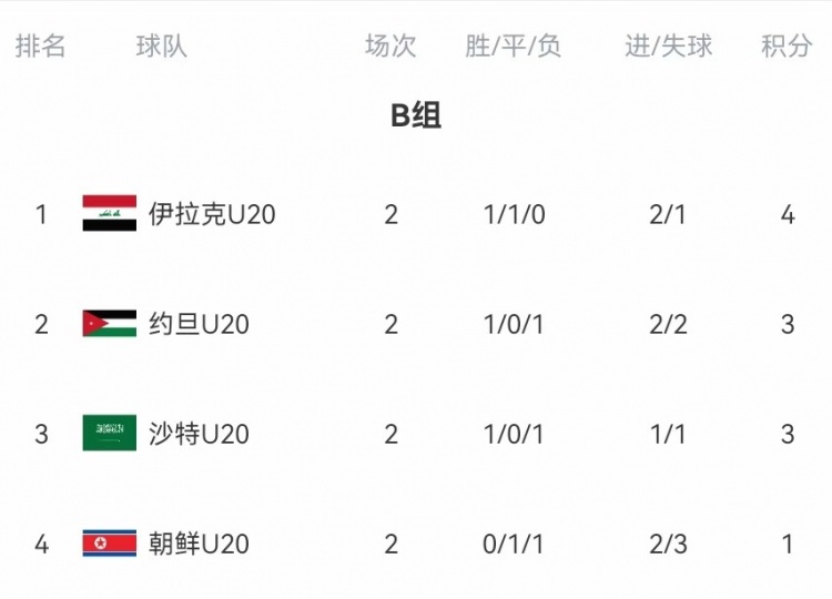 不過(guò)B組當前形勢較為復雜,沙特U20將在末輪對陣朝鮮U20、伊拉克U20則將和約旦U20對話(huà)。4支球隊均存在晉級可能和出局可能。除了朝鮮U20之外,其他3隊都可能成為小組頭名。由于B組末輪比賽將在明日才會(huì )開(kāi)戰,也無(wú)從參考。
