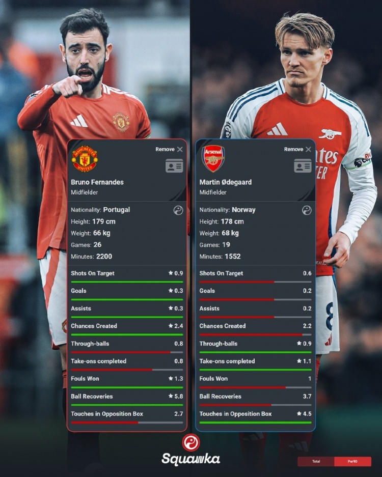 3月8日訊 曼聯(lián)將在本輪英超迎戰阿森納,數據機構squakwa也對比了兩隊核心的本賽季英超每90分鐘關(guān)鍵數據,B費在多項數據領(lǐng)先。