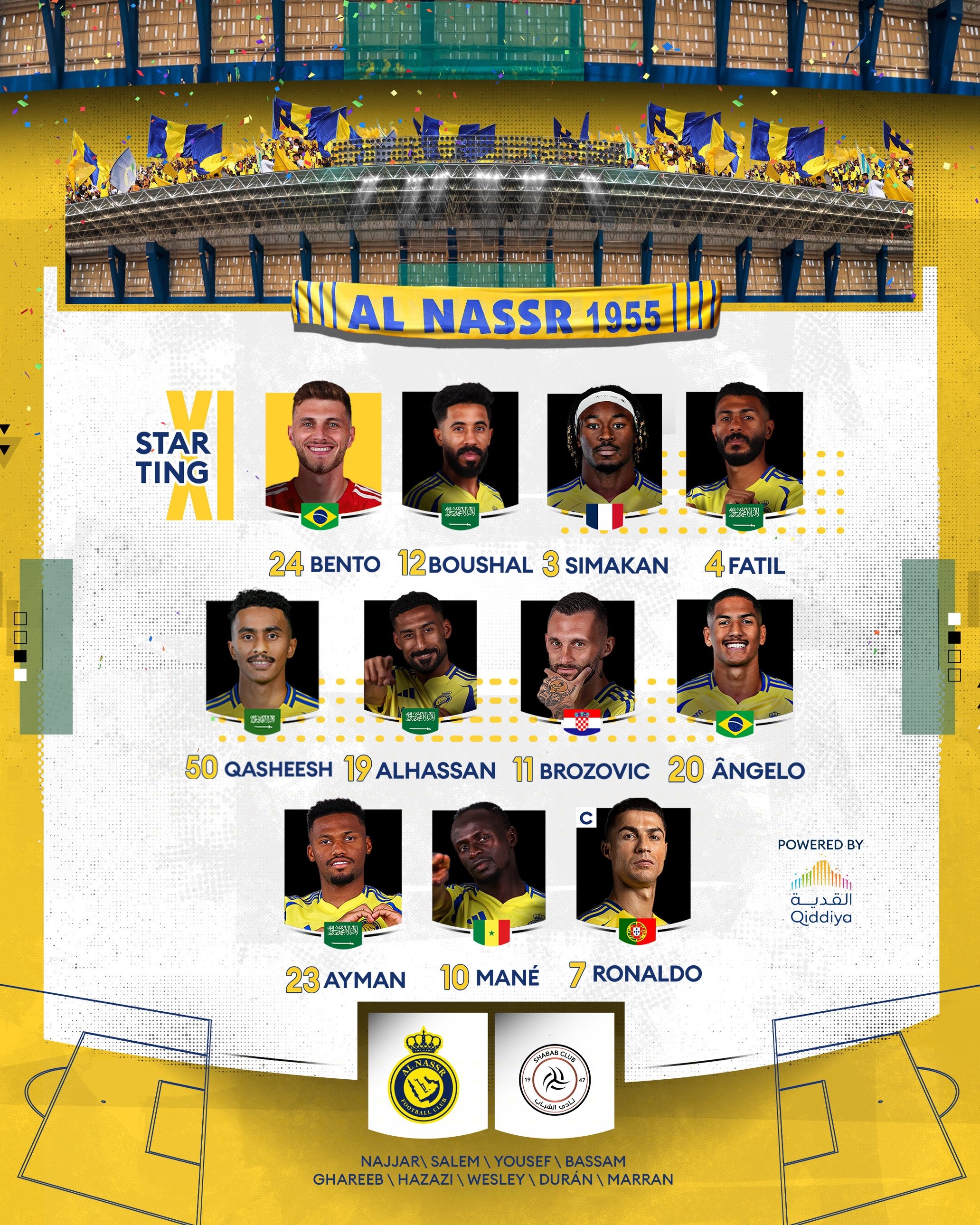 利雅得青年人替補:33-邁伊沃夫、5-阿爾沙里、12-卡納巴、17-尚吉蒂、21-薩迪、34-杜拜、38-哈布什、70-卡馬拉、71-阿爾泰恩