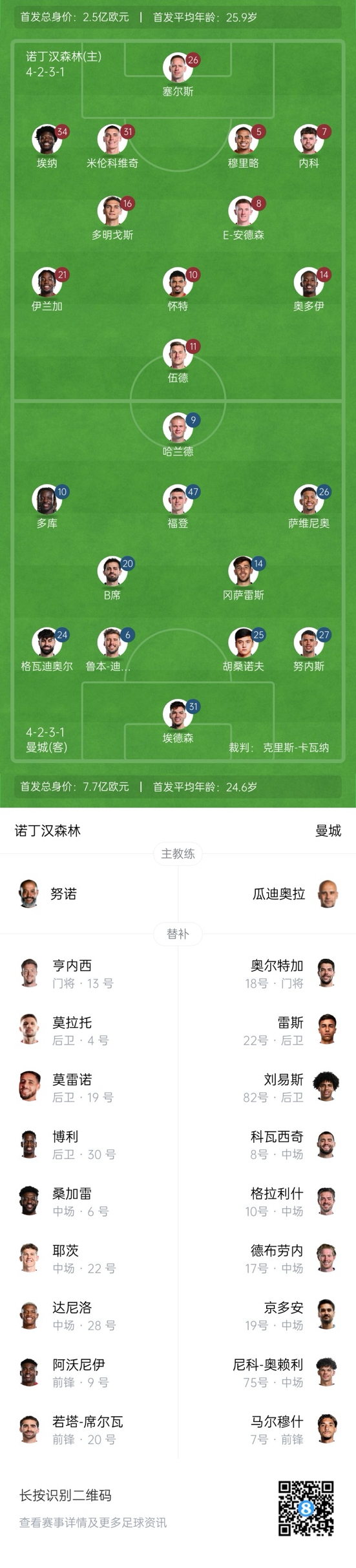 諾丁漢森林替補:13-亨內西、4-莫拉托、6-桑加雷、9-阿沃尼伊、19-阿萊克斯-莫雷諾、20-若塔-席爾瓦、22-耶茨、28-達尼洛、30-博利