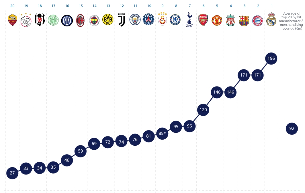 2024歐洲俱樂(lè )部球衣和商品收入排行(單位:歐元):