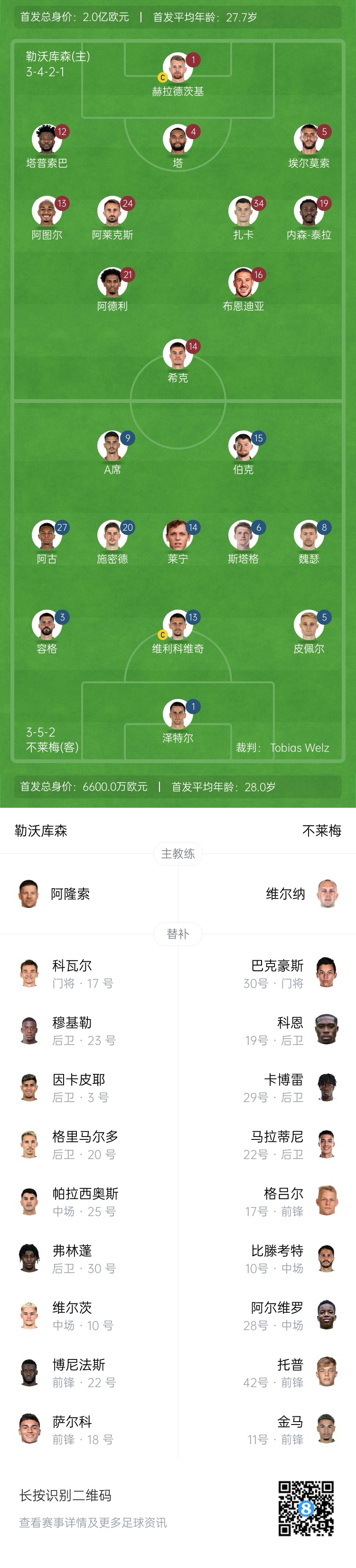 勒沃庫森替補:17-科瓦爾、3-因卡皮耶、10-維爾茨、18-薩爾科、20-格里馬爾多、22-博尼法斯、23-穆基勒、25-帕拉西奧斯、30-弗林蓬