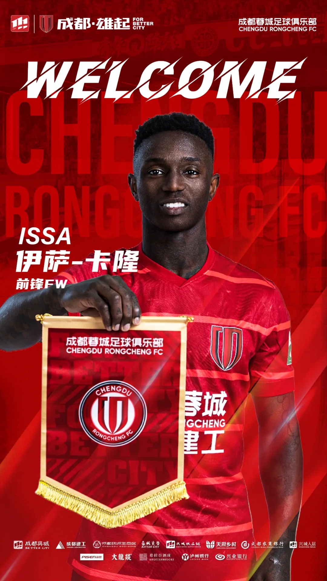 歡迎伊薩·卡隆來(lái)到成都,加入成都蓉城的大家庭。你的到來(lái),將幫助蓉城在新賽季中取得更優(yōu)異的成績(jì)!