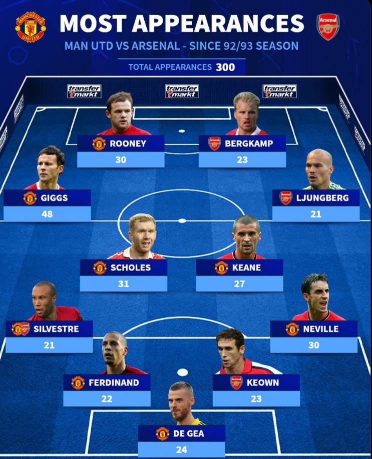 中場(chǎng):吉格斯(曼聯(lián),48場(chǎng))、斯科爾斯(曼聯(lián),31場(chǎng))、基恩(曼聯(lián),27場(chǎng))、永貝里(阿森納,21場(chǎng))