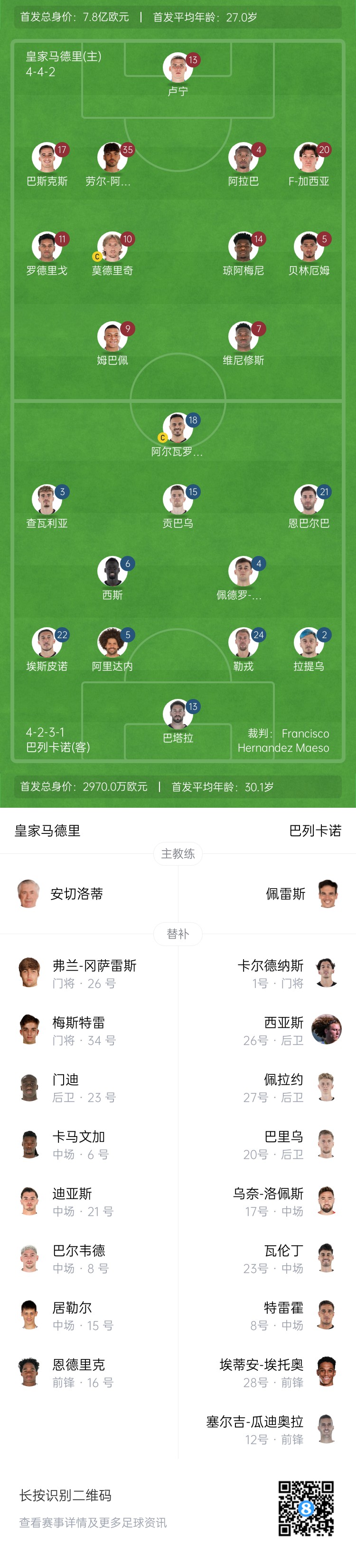 皇馬替補:34-梅斯特雷、26-弗蘭-岡薩雷斯、6-卡馬文加、8-巴爾韋德、15-居勒爾、16-恩德里克、21-迪亞斯、23-費蘭-門(mén)迪