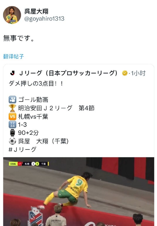 好在經(jīng)過(guò)一番檢查,吳屋大翔并無(wú)大礙,并回到球場(chǎng)繼續比賽,比賽結束后,吳屋大翔也轉發(fā)了自己“出糗”視頻,并寫(xiě)道“平安無(wú)事?!?,再次讓球迷們安心。