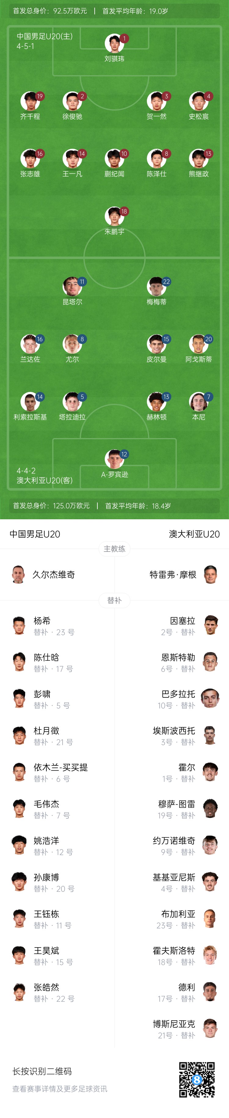 2月18日訊 北京時(shí)間19點(diǎn)30分,U20亞洲杯小組賽A組第三輪,中國vs澳大利亞,賽前雙方首發(fā)公布!本場(chǎng)比賽劉誠宇因累積黃牌停賽,較上場(chǎng)比賽國青首發(fā)更換6人,澳大利亞則更換了9人。
