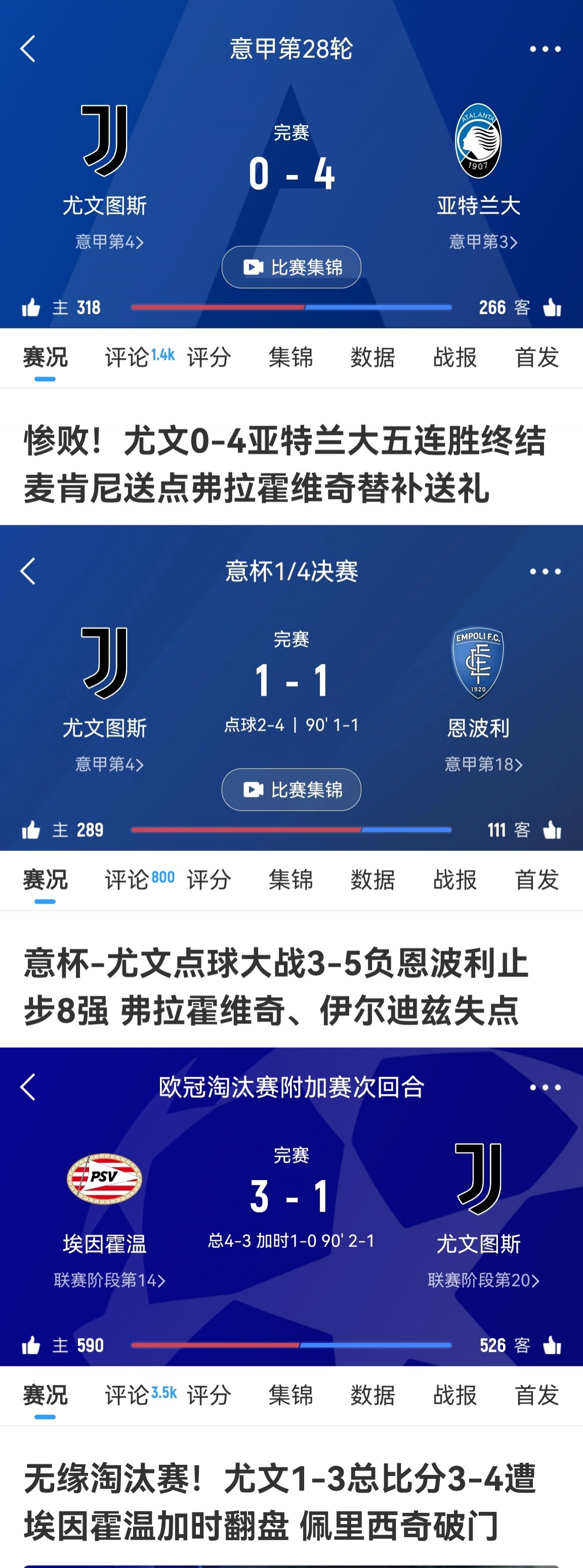 意杯賽場(chǎng),尤文1/4決賽點(diǎn)球大戰不敵保級隊恩波利。歐冠賽場(chǎng),球隊1比3被荷甲第2埃因霍溫加時(shí)賽翻盤(pán)。