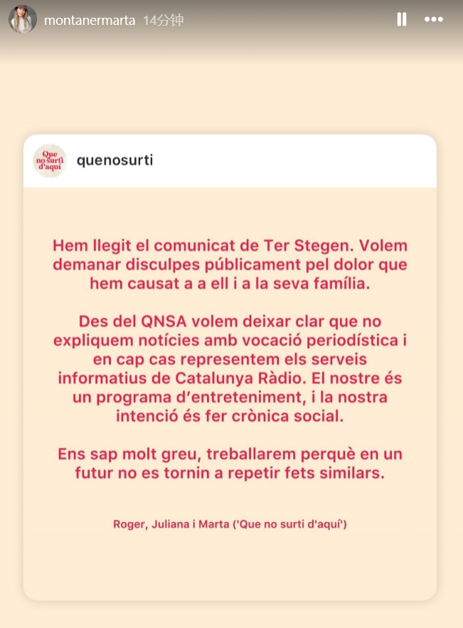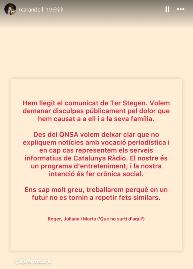 從節目《Que no surti d’aquí》的角度,我們想明確表示,我們并非以新聞視角報道事件,也不代表加泰羅尼亞廣播電臺的新聞服務(wù)。我們的節目是娛樂(lè )性質(zhì)的,我們的目的是進(jìn)行社會(huì )紀實(shí)。