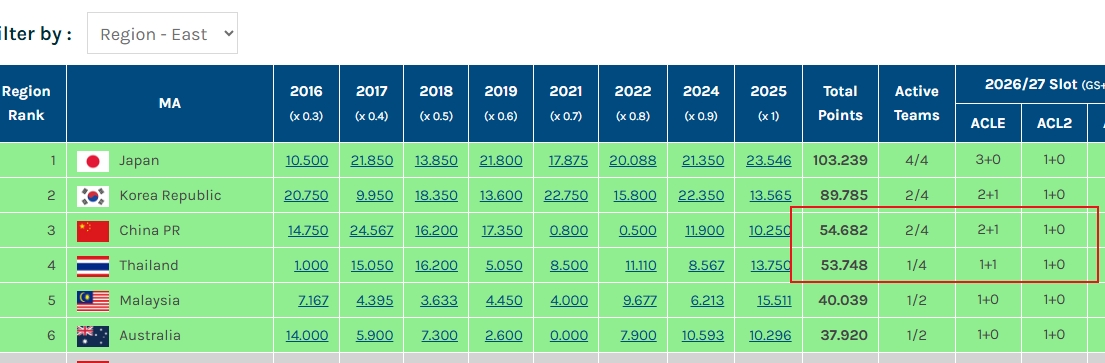在泰山退賽情況下,目前中超球隊在亞冠賽場(chǎng)僅剩海港、申花兩隊爭取技術(shù)分。目前中國積分為54.682,身后泰國積53.748分虎視眈眈。一旦中國被泰國超越,那么26/27亞冠精英聯(lián)賽的名額將縮減為1+1。