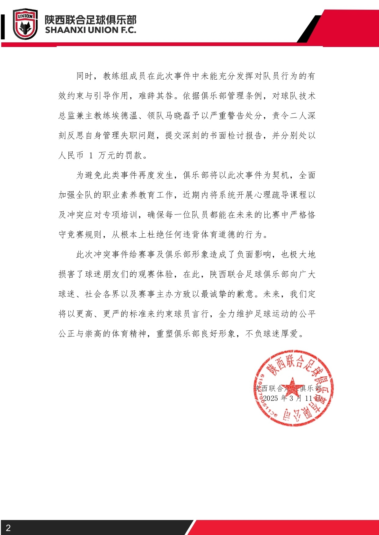 此次沖突事件給賽事及俱樂(lè )部形象造成了負面影響,也極大地損害了球迷朋友們的觀(guān)賽體驗,在此,陜西聯(lián)合足球俱樂(lè )部向廣大球迷、社會(huì )各界以及賽事主辦方致以最誠摯的歉意。未來(lái),我們定將以更高、更嚴的標準來(lái)約束球員言行,全力維護足球運動(dòng)的公平公正與崇高的體育精神,重塑俱樂(lè )部良好形象,不負球迷厚愛(ài)。