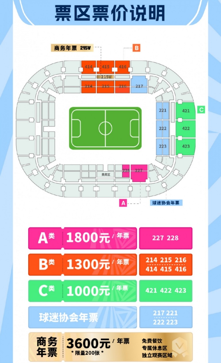 本次年票銷(xiāo)售,分為商務(wù)年票和看臺年票,其中商務(wù)年票的價(jià)格為3600元,限量200張;看臺年票共分為三檔,價(jià)格分別為1000元、1300元和1800元。