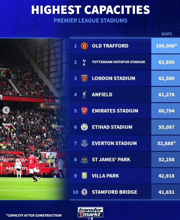 3月11日訊 曼聯(lián)已經(jīng)官宣將建造能夠容納10萬(wàn)人的新主場(chǎng),《轉會(huì )市場(chǎng)》也列出了數年后的英超各隊主場(chǎng)容量榜。