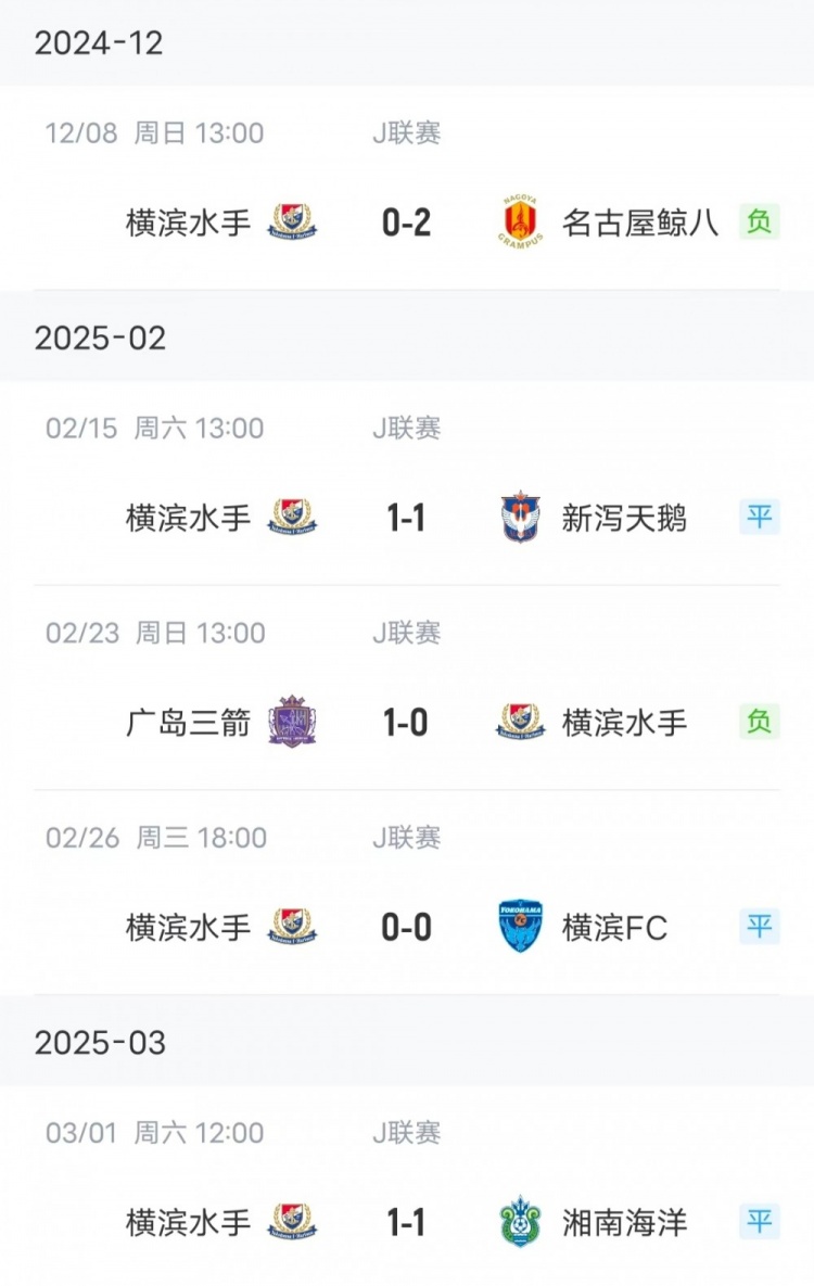 數據顯示,本賽季J聯(lián)賽戰罷5輪,橫濱水手還未嘗勝績(jì),4輪聯(lián)賽(橫濱少賽一場(chǎng))僅3平1負打進(jìn)2球,目前積3分排在J聯(lián)賽積分榜第18位。而算上上賽季的話(huà),橫濱水手在J聯(lián)賽已經(jīng)連續5場(chǎng)不勝(3平2負打進(jìn)2球丟掉5球)。