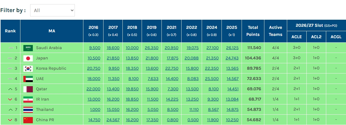 但如果申花被淘汰,則本賽季結束后中國的亞足聯(lián)俱樂(lè )部技術(shù)分一定會(huì )落后于泰國,這意味著(zhù)中超球隊參加26/27賽季的亞足聯(lián)賽事名額從2+1+1降為1+1+1(一支直通亞冠精英正賽+1個(gè)亞冠精英附加賽+1支直通亞冠二級聯(lián)賽正賽)。