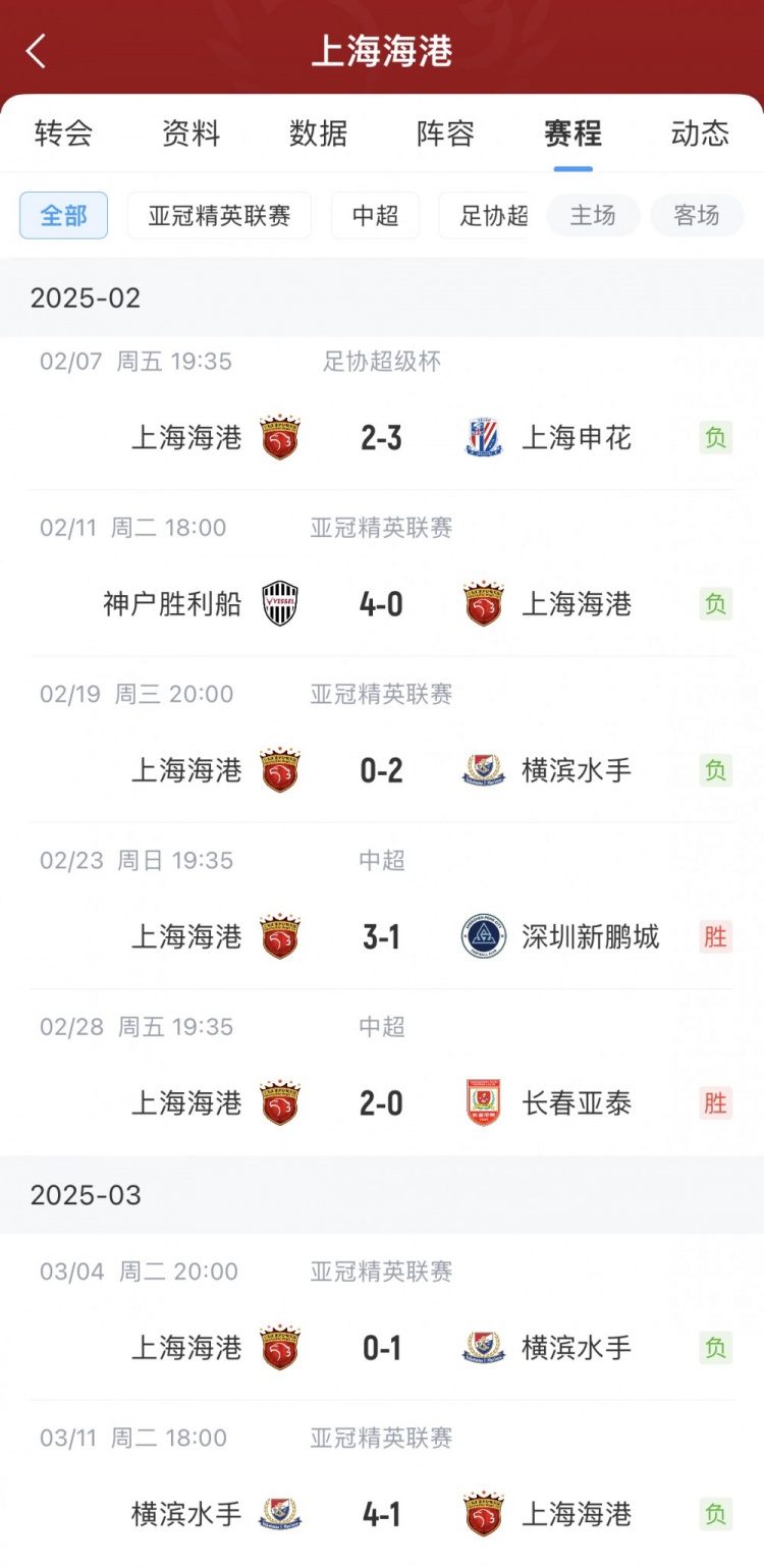 這7場(chǎng)比賽中,海港隊輸掉了其中5場(chǎng),這造成球隊痛失超級杯冠軍,以及在亞冠精英聯(lián)賽止步于16強。不過(guò)在中超聯(lián)賽中,海港隊取得連勝,且2場(chǎng)聯(lián)賽僅失1球。