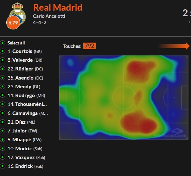 可以想到,因為在缺少大中鋒的情況下,他們不可能按照過(guò)去有中鋒時(shí)(哪怕是何塞-盧)那樣的傳中、搶點(diǎn)、后排套上爭搶機會(huì )模式來(lái)打了。維尼修斯、羅德里戈、包括姆巴佩都是在突擊方面遠勝過(guò)被迫的站樁方面效率選手,因此,他們也會(huì )自主扯到邊路來(lái)踢球。