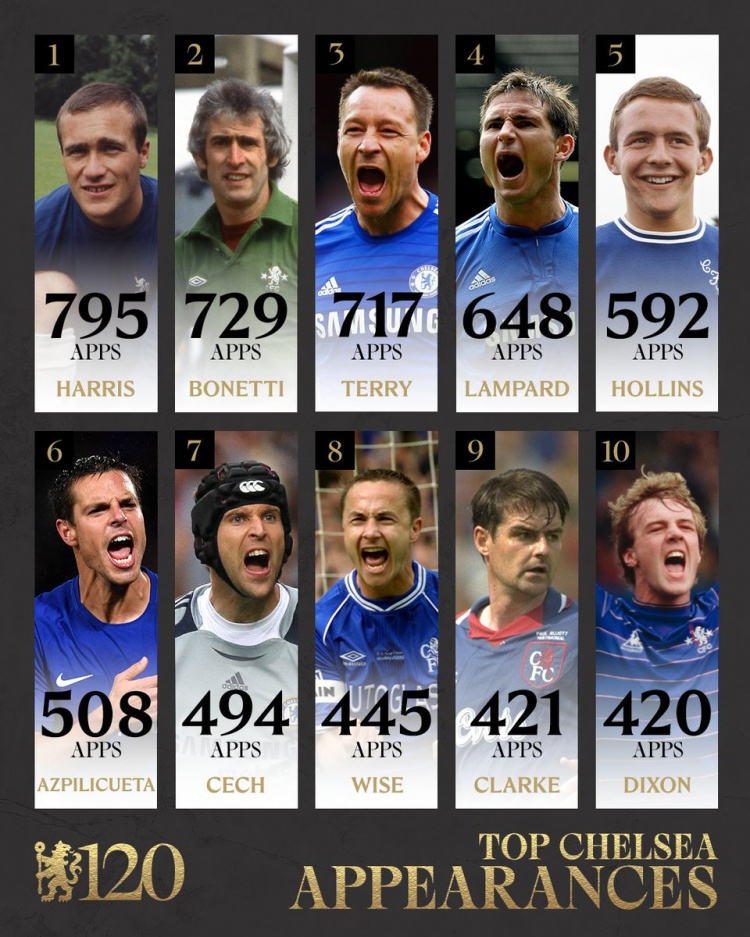 3月12日訊 切爾西俱樂(lè )部成立120周年,球隊官方社媒曬截至目前球員代表球隊出場(chǎng)次數榜,羅恩-哈里斯第一,特里第三,蘭帕德第四,AZP第六,切赫第七。