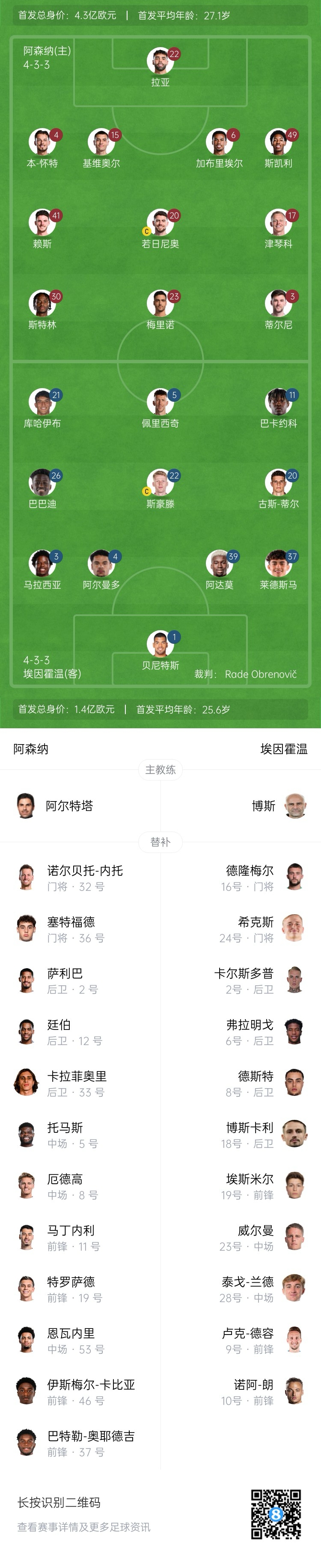 阿森納首發(fā):22-拉亞、4-本-懷特、15-基維奧爾、6-加布里埃爾、49-斯凱利、41-賴(lài)斯、20-若日尼奧、17-津琴科、30-斯特林、23-梅里諾、3-蒂爾尼
